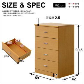 日本の住宅に合わせたちょうどいいコンパクトなチェストです!金属製スライドレールで引出しの抜け落ちを防止します!どんなお部屋に合うサイズ&フォルムでお勧めのチェストです!・エコファ加工で抗菌・防臭効果で安心!・金属製スライドレールで引出しの抜け落ちがありません!・合計4杯の引出しで抜群の収納力!サイズ外寸:幅59 x 奥行42 x 高さ90.5cm内寸:幅51.5 x 奥行34 x 深さ13cm(4杯)素材材質:パーチクルボード、中密度繊維板(MDF)、プリント紙化粧合板【エコファ加工商品】「エコファ加工」された商品には、有害物質を分解したり、ウィルス菌やバクテリアの繁殖を抑える効果があります。