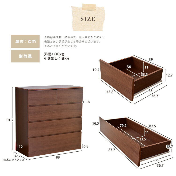 ●商品詳細 -infomation- 商品名 Falke 4段チェスト【ファルケ】 サイズ 幅88×奥行39×高さ91.2(cm) 材 質 プリント紙化粧繊維板 カラー ・ダークブラウン ・ナチュラル 重 量 本体重量:約41kg 耐荷重:天板約30kg/引き出し約9kg 梱包サイズ 梱包1:幅95.5×奥行41.8×高さ16.5(cm)/約21kg(梱包材含む) 梱包2:幅94×奥行43.5×高さ13(cm)/約25kg(梱包材含む) 備 考 ※他商品との同梱は出来かねます。