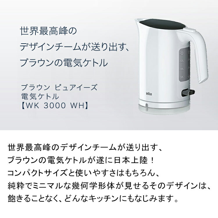 ブラウン ピュアイーズ 電気ケトル [WK3000WH] | delonghi 公式 おしゃれ ケトル 湯沸かしポット 電気ポット 湯沸かしケトル 電気 ポット 小型 家電 白 braun 電気湯沸かし器 コンパクト 1l ホワイト オシャレ家電 キッチン家電 湯沸かし器