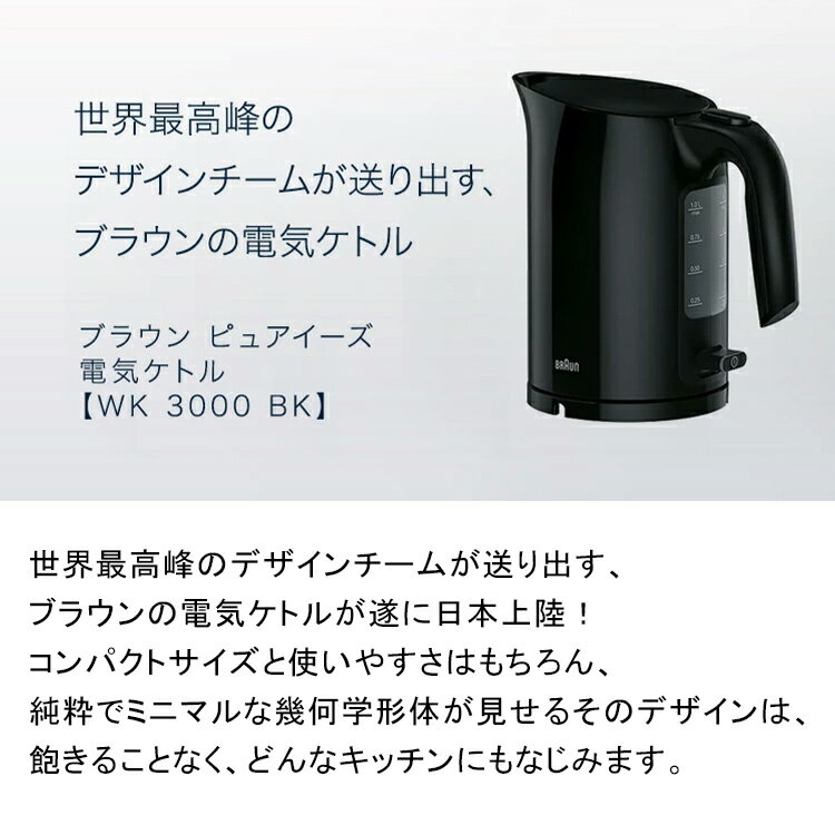 ブラウン ピュアイーズ 電気ケトル [WK3000BK][1L]|Braun 公式ストア おしゃれ ケトル 湯沸かしポット 電気ポット 湯沸かしケトル 電気 ポット 小型 黒 家電 電気湯沸かし器 コンパクト ブラック オシャレ家電 キッチン家電 湯沸かし器 一人暮らし