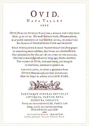 オーヴィッドとはオヴィディウス(Publius Ovidius Naso)という帝政ローマ初期の詩人の名前で、「恋の技法」や「メタモルフォシス」、「悲歌」、「黒海からのたより」など、後世の文学や美術に多大なる影響を与え、英米文学界では広く知られた人物です。